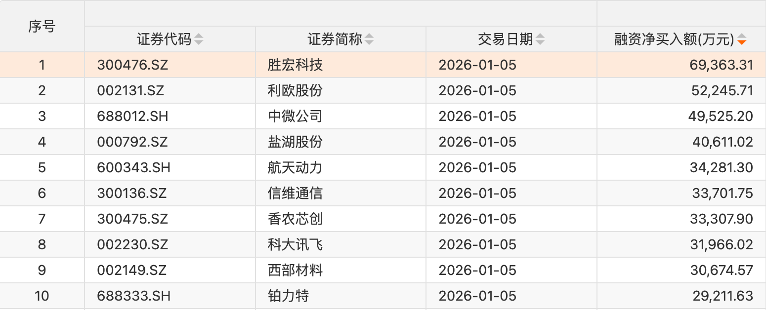 个股方面,63只个股获融资净买入额超1亿元。胜宏科技获融资净买入额居首,净买入6.94亿元;融资净买入额居前的还有利欧股份、中微公司、盐湖股份、航天动力、信维通信、香农芯创、科大讯飞、西部材料、铂力特(维权)等。